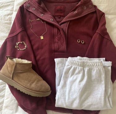 If comfort is your priority, a comfy-chic outfit is always a great choice. A matching sweatset instantly looks coordinated and stylish with almost no effort. If you don’t have a matching set, sweatpants paired with a graphic tee or oversized hoodie create the same relaxed effect. Comfortable sneakers or slip-on shoes complete the look and make walking around school easy. The key with comfy outfits is choosing pieces that feel intentional rather than thrown together, so sticking to similar tones or adding one standout graphic piece helps the outfit feel styled instead of sleepy.